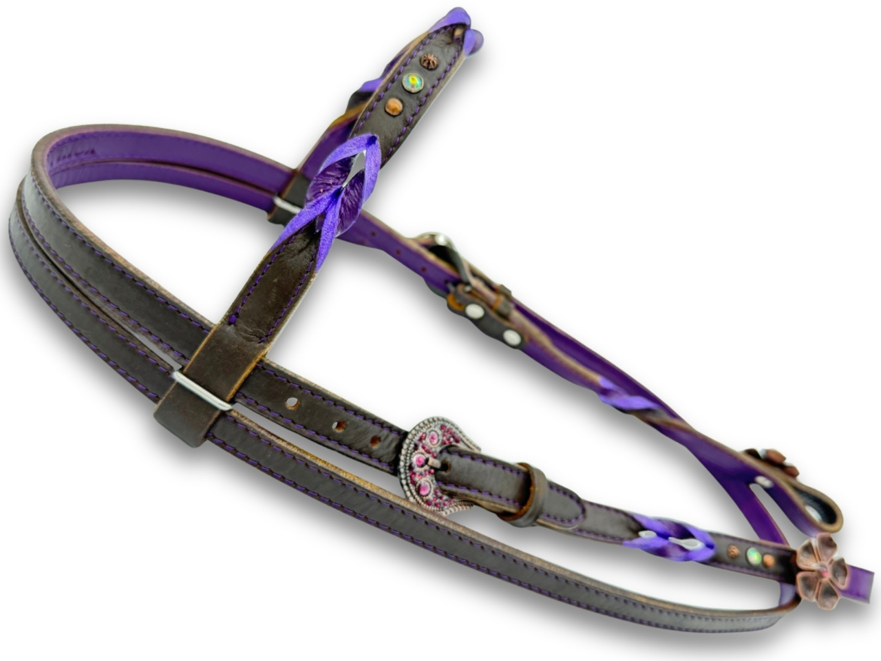 - Lila Eyecatcher: Handgeflochtene Leder Elemente in intensivem Lila mit Glitzer setzen markante Kontraste am Stirnriemen und den Backenstücken.