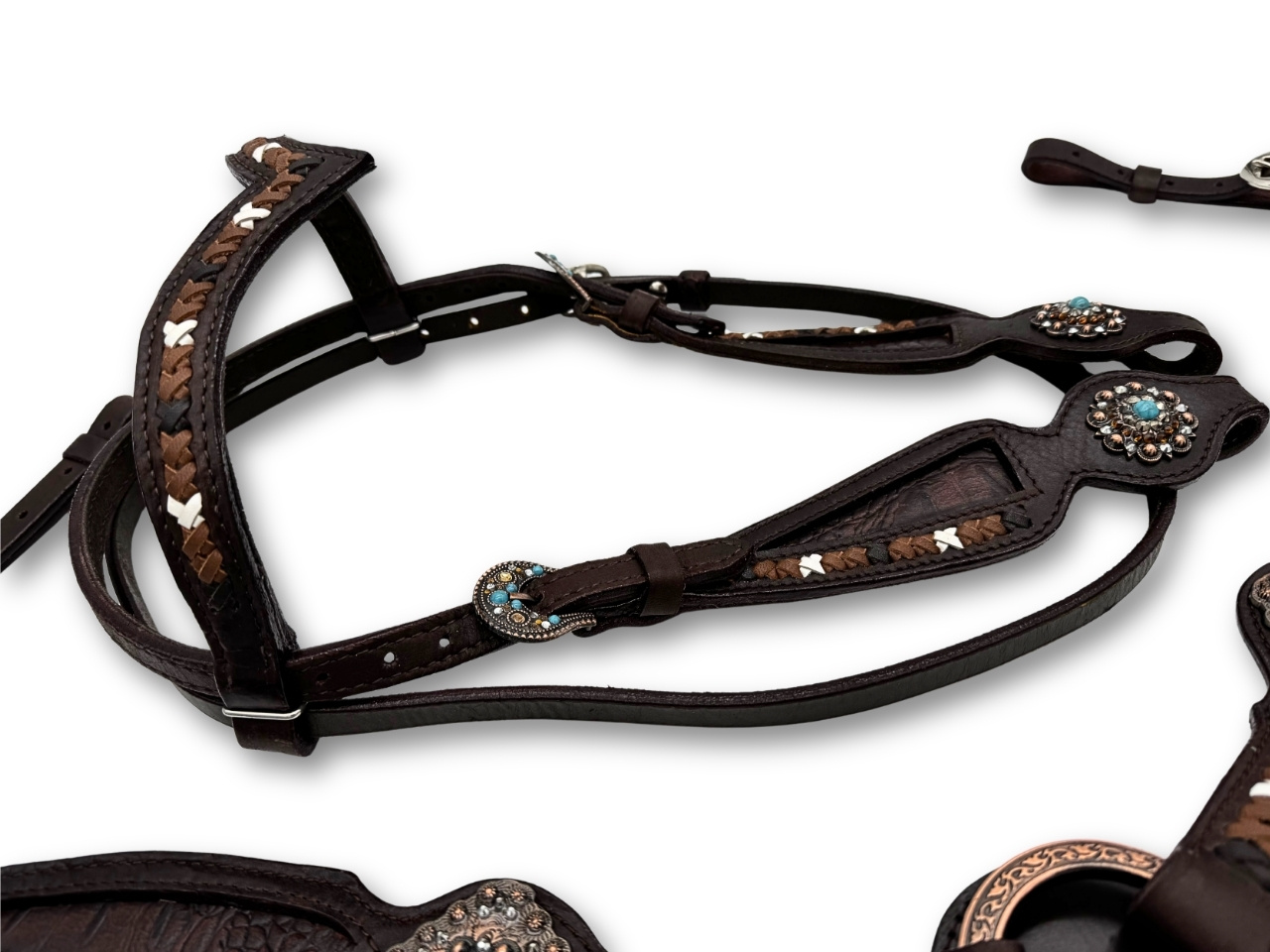 Setze ein echtes Statement im Sattel und verleihe deinem Pferd mit diesem detailverliebten Western-Set aus dunkelbraunem Qualitätsleder einen Look, der traditionelles Handwerk mit modernem Show-Flair perfekt vereint.