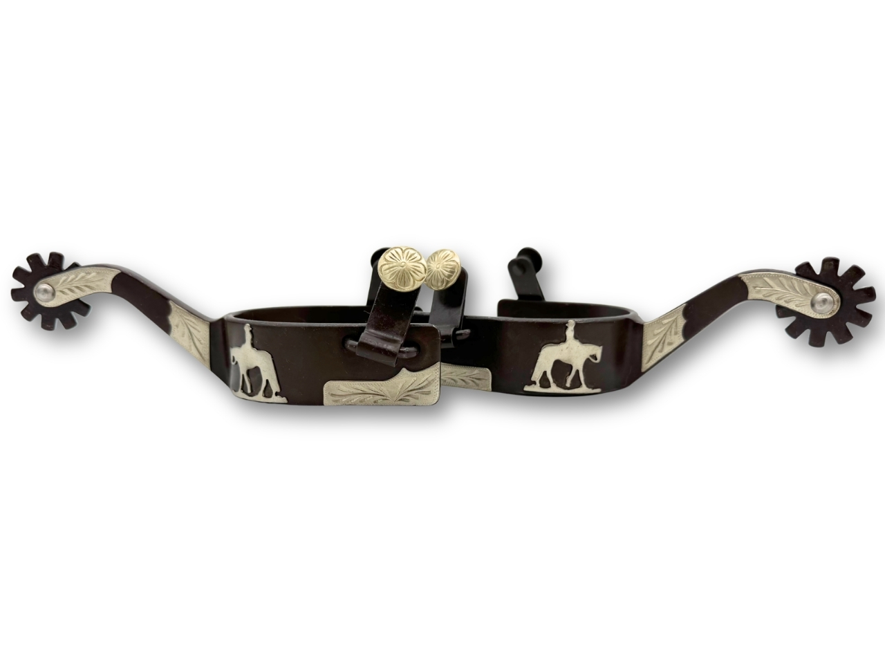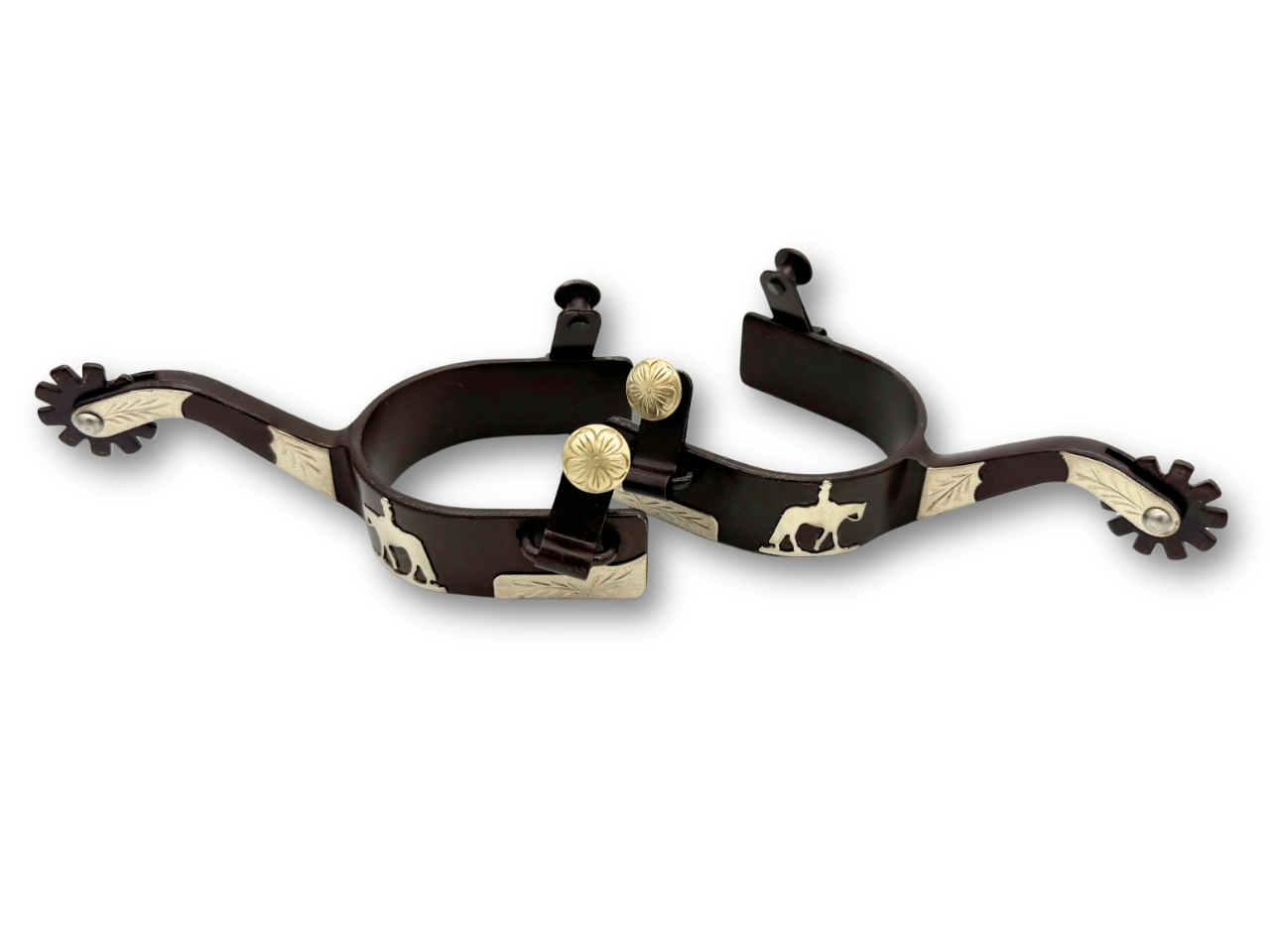 Setze ein Statement mit diesen Westernsporen mit gravierter Verzierung und einzigartigem riding horse Emblem.