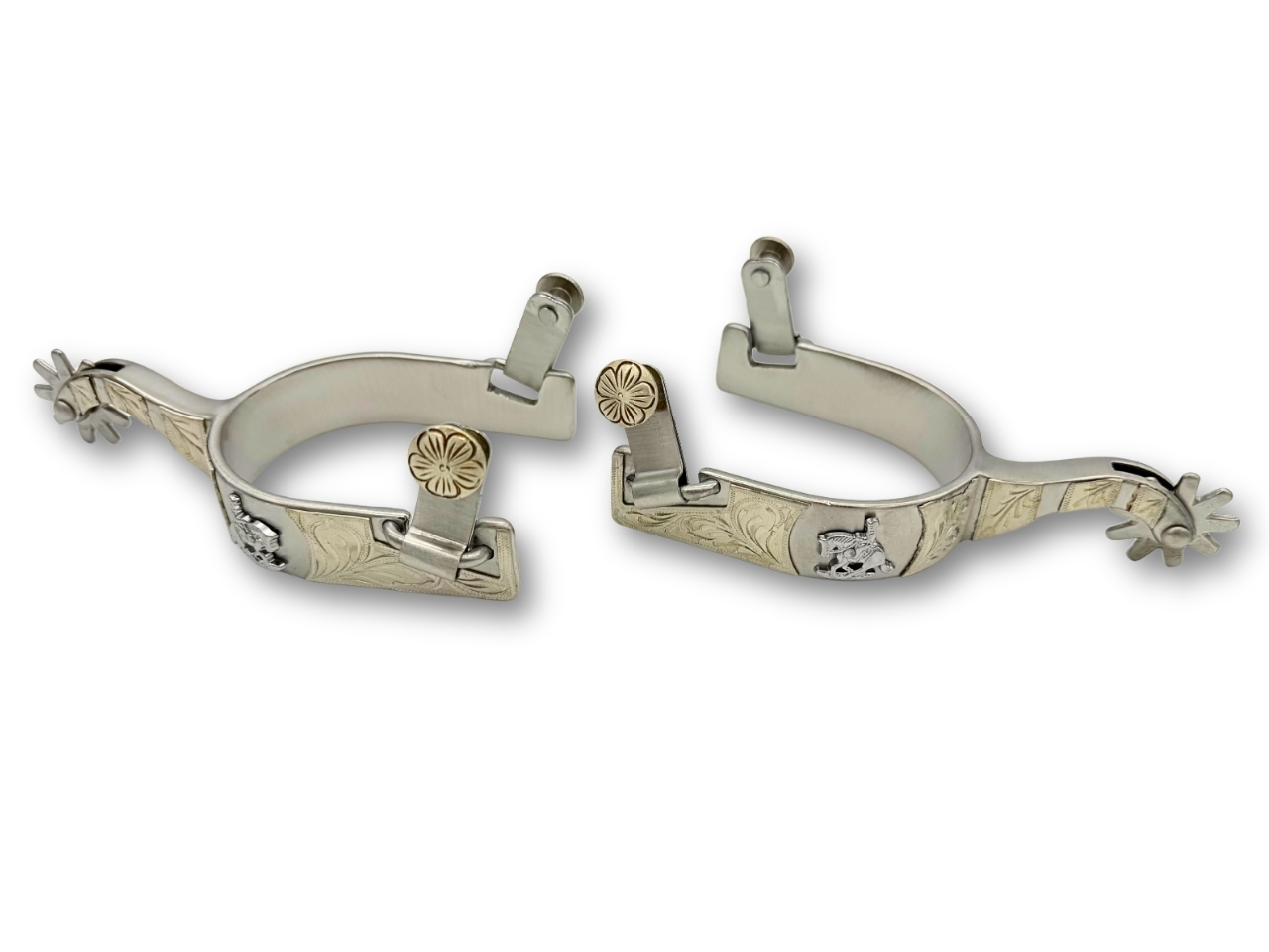Setze ein Statement mit diesen Westernsporen mit gravierter Verzierung und einzigartigem Reining horse Emblem.
